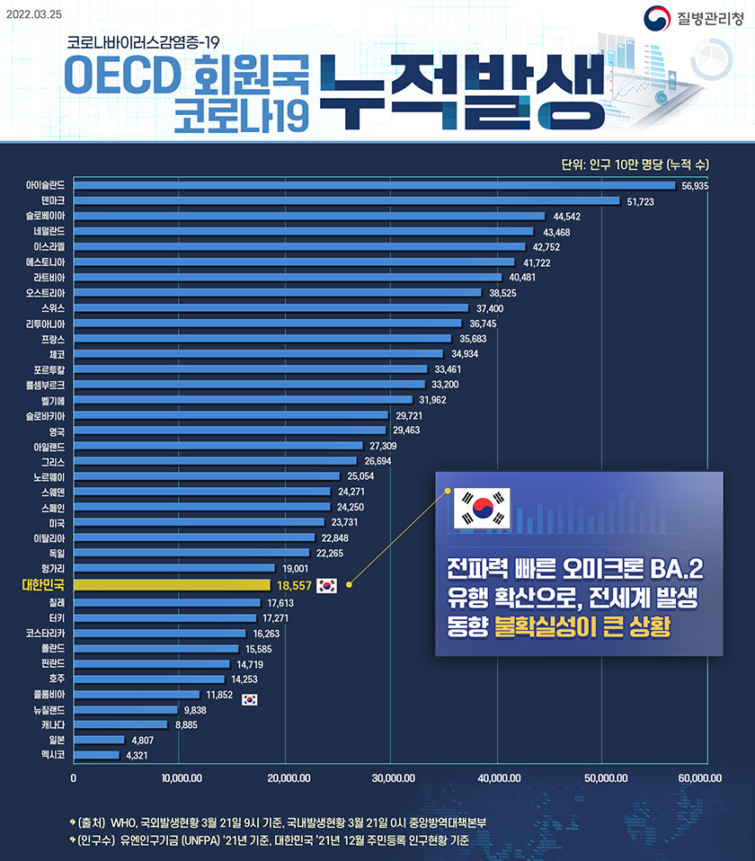 [질병관리청]OECD 회원국 코로나19 누적 발생·사망 그래프(3.21.