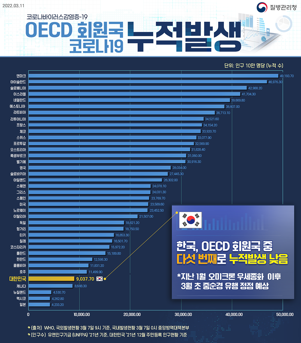 [질병관리청]OECD 회원국 코로나19 누적 발생·사망 그래프(3.7.기
