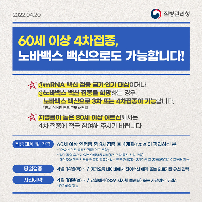 [질병관리청]60세 이상 4차접종, 노바백스 백신으로도 가능합니다!