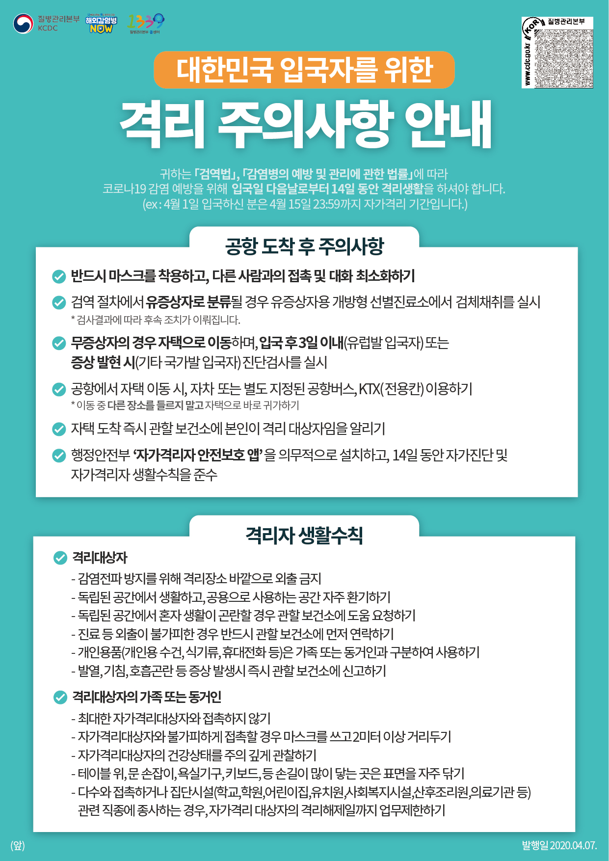[질병관리본부] 코로나19 대한민국 입국자를 위한 격리 주의사항 안내 포